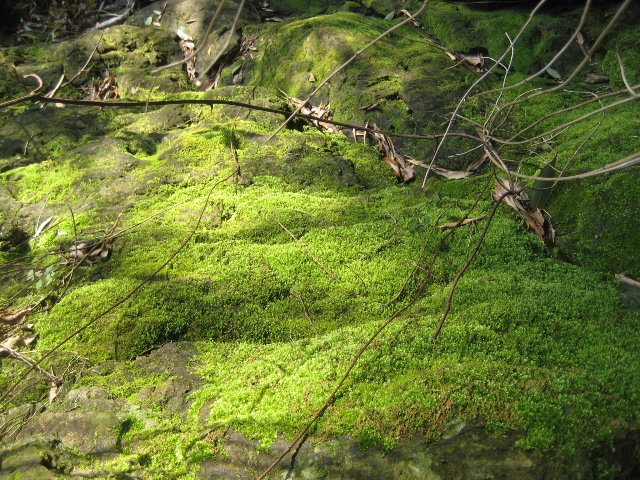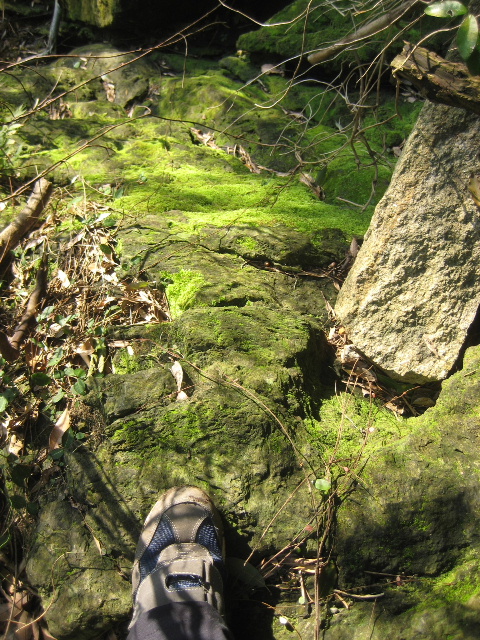 露岩の斜面は適度な日照が得られるせいか、一面に苔が生えている。西日に映えて大変美しい。