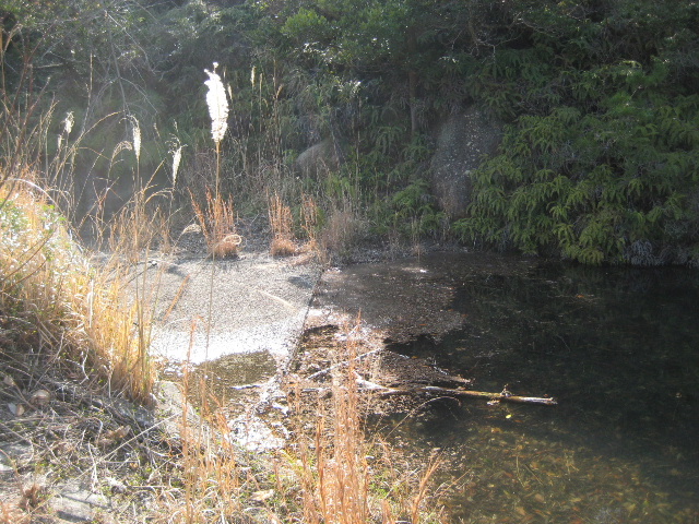 普通の溜め池なら堰堤のほぼ中央部分に樋門があり、調整しつつ灌漑用水を取り出せるようになっているものである。ところが門前池にはそれが見当たらない。答は意外に容易だった。左岸の中ほどにコンクリート階段と水中に伸びる鉄棒が見えかけていたからだ。