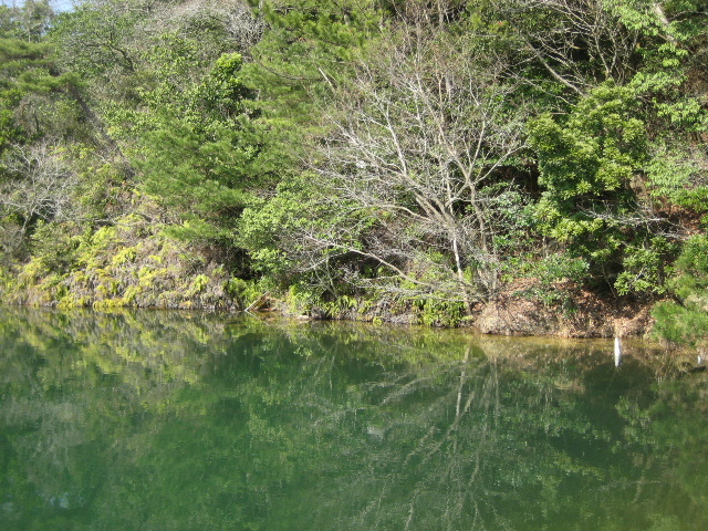 さて、神秘的とも思える門前池の眺めを愉しんだ後はもう少し周囲を調べてみようか。気になることがあるのだ。写真ではハッキリ出ないが、堰堤部の斜面が下の方まで見えていた。