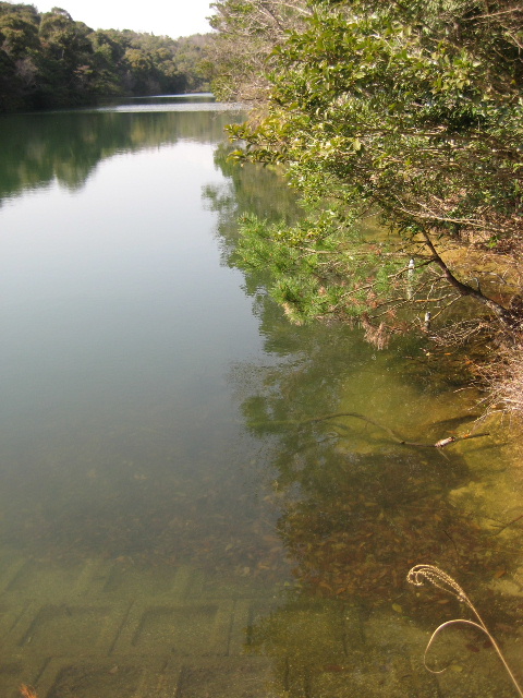 平ブロックの下の方には枯れ葉が溜まっている。その部分まで堰堤上から見透せた。
