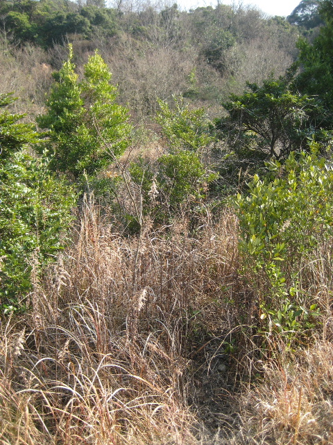 野生動物の後を追うようにその踏み跡から下の雛壇へ降りた。足元の地面は何とか分かるが前方の藪が酷い。