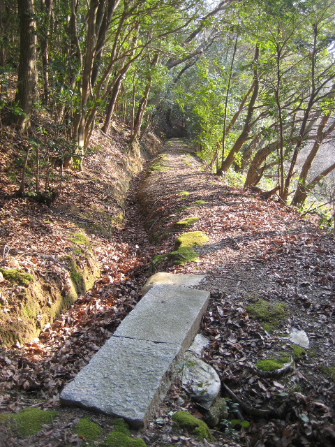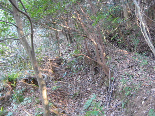 酷く藪に包まれて突撃意欲を萎えさせたのは自転車を停め置いた場所から10m程度で、我慢して水路に沿って進むとその奥は意外に鮮明な道の跡が見えていたのだった。