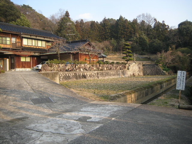 農道は民家の横ではなくモロに庭先へ繋がっていた。この農道は里道ではなくこのお宅が畑まで行き来するために拵えた道らしかった。完全な一本道で他の何処にも出られない。