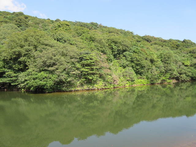 堰堤の中ほどまで戻ったところで最後に全体の入るショットを撮った。このとき池の東側の入り江に不自然な場所を見つけた。