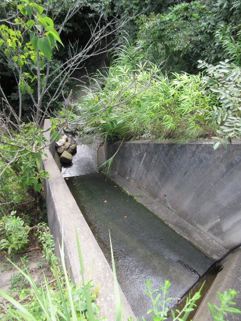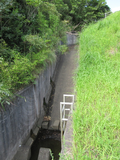 思うに元から存在しないのかも知れない。溜め池の堰堤下に田畑が広がるような場所なら灌漑用水を送る水路が必要だが、この近辺で厚東川へ向いて流れる溜め池なら、市道近辺まで下って来なければ田畑が存在しないからだ。溜め池の整備は灌漑用水向けと言うより治水目的の方が大きいのだろう。