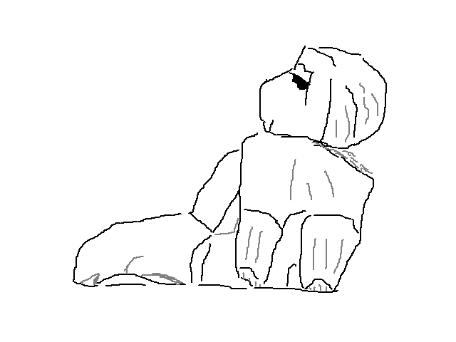 一連の物件は、FBページ[1]とFBタイムライン[2]で公開している。タイムラインで何に見えるか尋ねたところ、寛いでいる仔犬に見えるという回答が2件あった。最上部の岩が丸っこくて後ろを向いている頭部に見える上に、ちょうど目の位置にあたる部分が欠けていて日陰を与えるために余計にでも目のように見える。最下段の岩も正面中ほどがやや窪んでいるせいで両側部分が腕のように見えるのである。