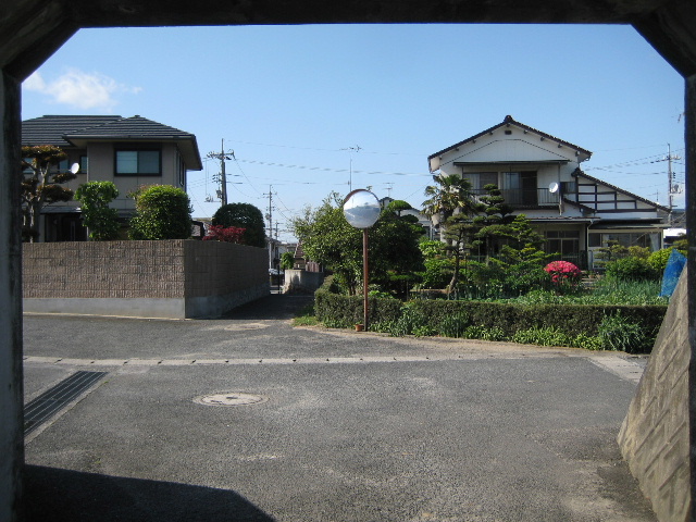 正面に存在意義がよく分からない古いミラーが立っており、真っ直ぐ降りる狭い道がある。