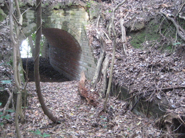 開削工法でレンガ隧道および火薬庫の敷地を確保するために山を切り崩し、後からレンガを組み上げて通路にしていると思う。