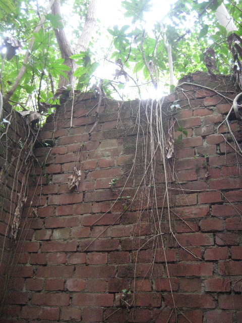 敷地外側を囲うレンガ壁。初回訪問時はこの辺りは完全に湖状態でまったく接近できなかった。