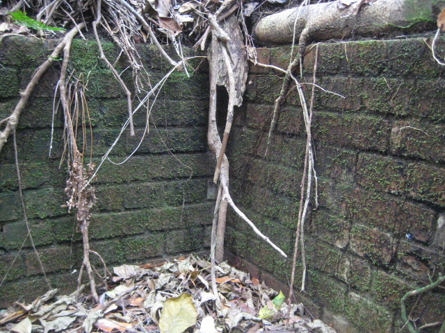 木の根がタコの足のようにレンガ壁にまとわりついていた。