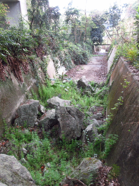 流路はコンクリートの三面張り水路に変わり、大岩が積み重なっている。