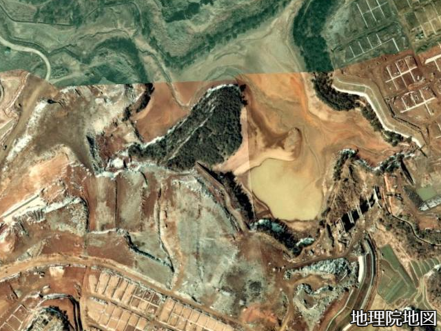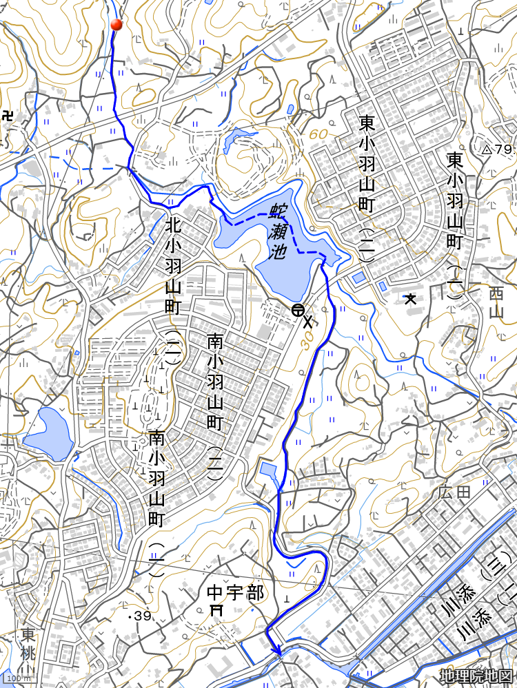 昭和49年度版の国土地理院航空映像では小羽山ニュータウンの造成中で、蛇瀬川に刻まれた深い谷地に蛇瀬橋を架けるためからか蛇瀬池の水位が著しく下がっている。このため溜め池以前の大まかな流路を推測できる。