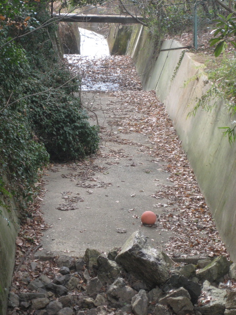 前回見つけた空気の抜けたボールはまだ同じ場所にあった。ここを余剰水が流下するような事態はよほど大雨が続かなければ有り得ない。それでも過去に余水吐から大水が流れ落ちたことは幾度かあった筈で、あの水路幅なら天端一杯か溢れるほどの水位で流れたのではないだろうか。