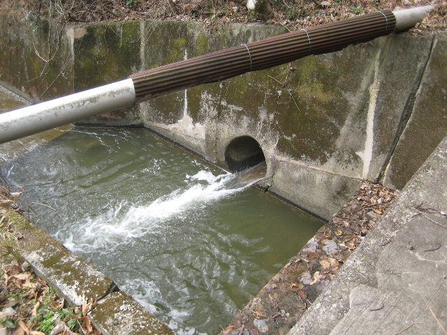 三面張りコンクリート水路に床版が架けられ、そのすぐ下に放流口があった。