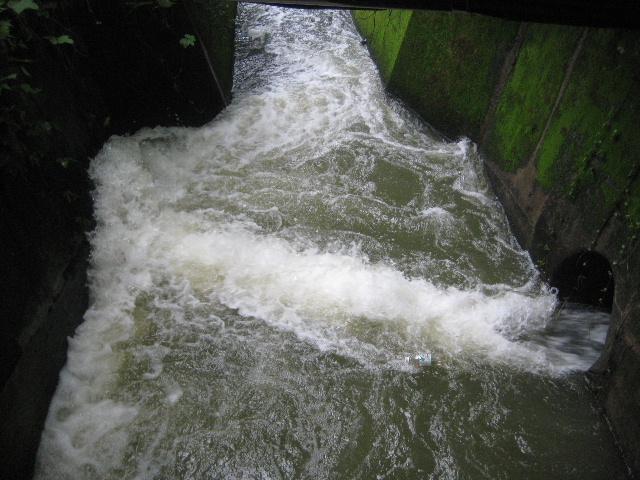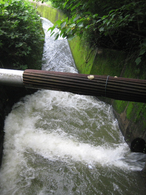 以下は雨続きで蛇瀬池の水位が上昇し、排出量が増えたときの映像である。本土手に居ても排出される水の音が聞こえていたので、出水口まで降りてきた次第だった。[2012/7/3]