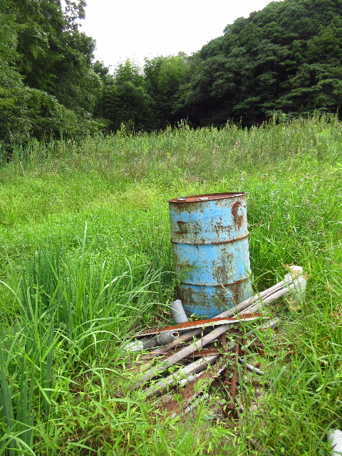 コンクリート土間の外にはドラム缶と資材が置かれていた。