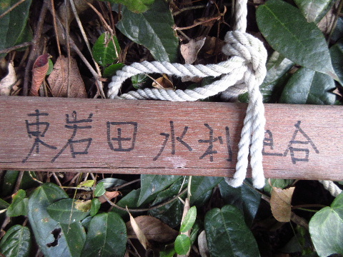 2. 堰板の取っ手にマジックで「東岩田水利組合」と書かれている。