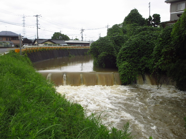 写真は真締川増水時に井堰を流れ落ちる様子。