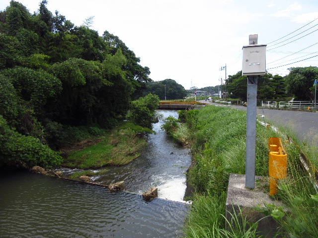 御手洗堰のすぐ横、市道真締川西通り2号線沿いにこの地点での雨量と水位を計測しデータ送信する水位観測機器が設置されている。