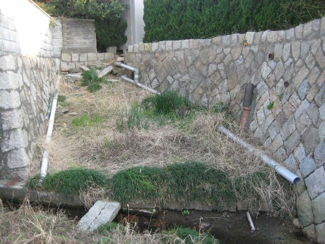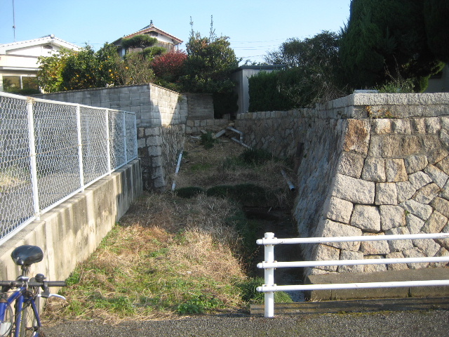 上の写真の位置関係で言えば、水路に対して左側は隣接する民家の畑地で、右側は何にも利用されていない荒れ地だった。この荒れ地にはススキや葦と思われる草が生い茂っていて、暖かい季節になると葦にびっしりと茶色のケムシがくっついているのが見えた。荒れ地は平坦ではなく掘り出した土を乱雑に積み上げたようになっていて、一部は歩道と水路の交差部へねぶり着けられていた。[1]