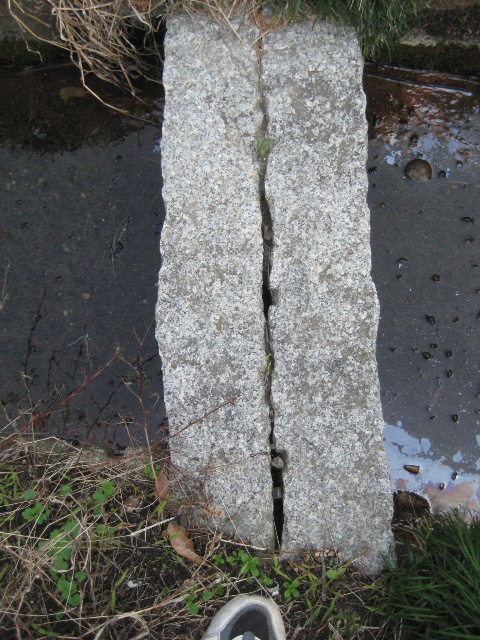即ちずっと昔からこの田へ出るための私有道があって、溝を安全に跨ぐために石橋を架けたのだろう。沢地にスーパーができて田がなくなってからも石橋は残り、駐車場を経てスーパーまで出られるように柵を開けておいた…というところだろうか。
