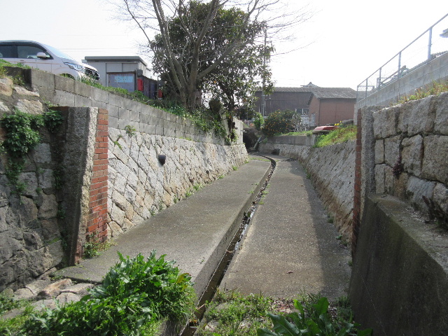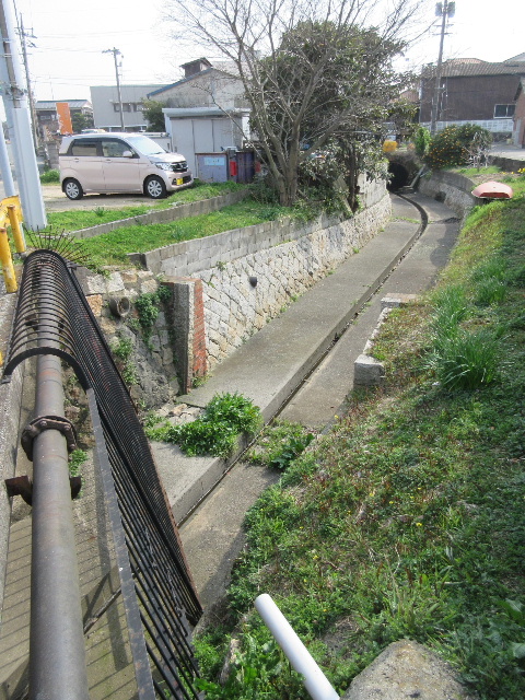 以前は雨水排水路として現在立っている水路を利用していた。しかし幅が狭いとか流下速度が遅いなどの理由から新たに市道の下に効率の良い函渠を埋設して岬明神川の流れを切り替えたのだろう。1m程度低くなっているということは、より早く海まで流れ出るよう勾配をきつくしているようで、その段差がここで現れている。