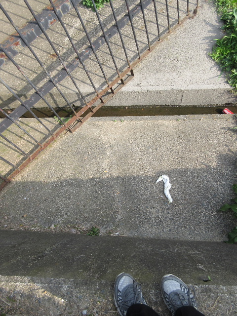 コンクリート側壁の上に腰掛け足を降ろそうとする途中に撮影している。