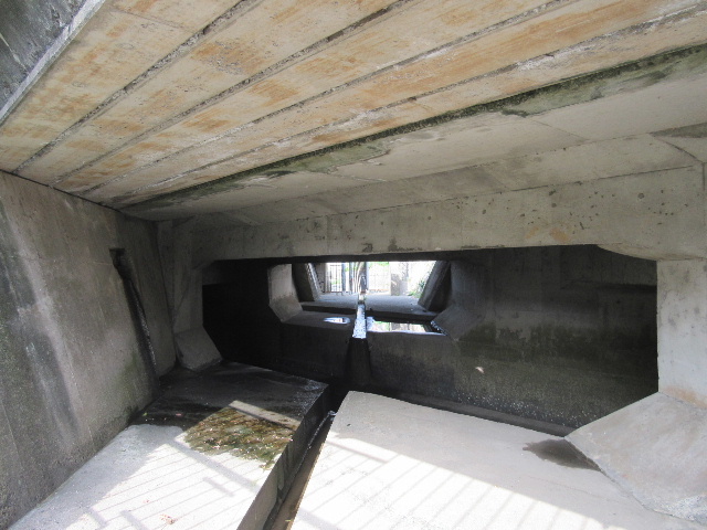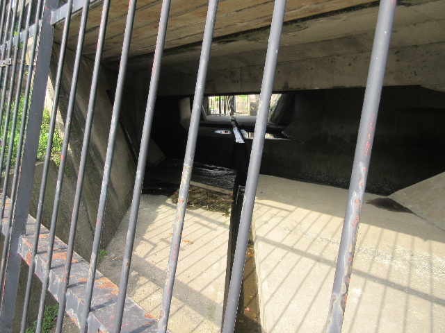 このレンガ積み部分のみを観察するなら別にリスクを冒して降りることはなかった。上からでも充分に眺められる。もう一つ気になるのは道路交差部の構造と下流側がどうなっているかの興味があったからだ。特に道路下へ目の細かい大型のスクリーンが掛けられているのが奇妙に思われた。