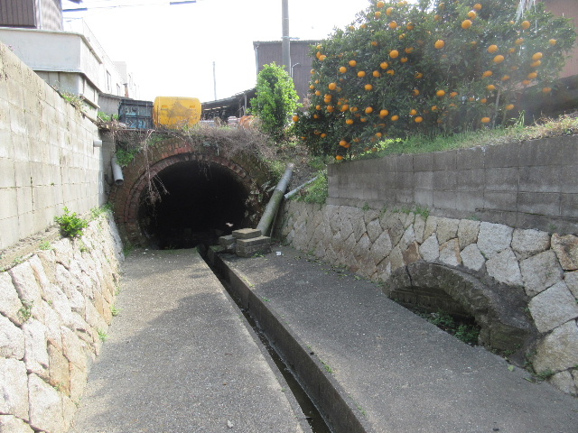 廃水路の開渠区間は民家の敷地へ突き当たったところで唐突に終わっていた。そこから先は…まるで鉄道の廃線トンネルみたいなレンガ巻きの隧道が口を開けていたのである。