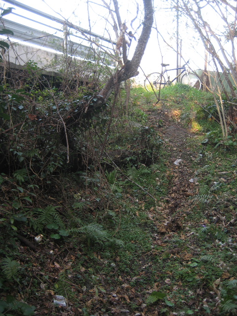 自転車をここまで連れて来た後、斜面を降りる。
