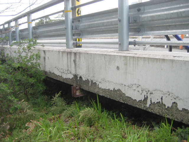 コンクリートの下部には基礎砕石を敷くのが常だから、土砂と一緒に流れ出てしまったようだ。これでは車道側のコンクリート基礎は殆ど張り出し歩道支持の役に立っていないだろう。 まあ、今はこの内側に転落防止柵を造って人が歩かないようにしているから大丈夫だが…