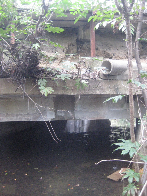 橋桁の高さが妙に低いことは、夫婦池との接続部を視認しようと苦労して川面へ接近したときから気づいていた。拡幅で造られたボックスカルバートは充分な高さが確保されているのに、古い端桁は水面からスラブ下まで1m程度しかない。