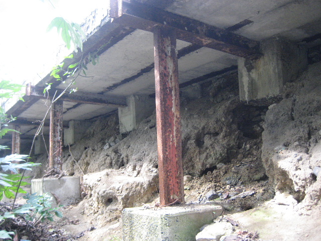 「流れるのでは…」と懸念する以前に、実際に流れ出てしまっていた。長年、横から降り込んだ雨で盛土部分が侵食され張り出し歩道の基礎コンクリートが宙に浮いている。