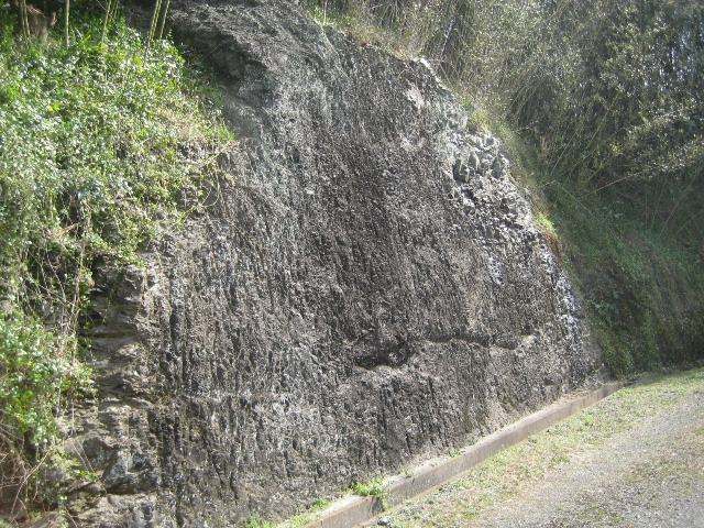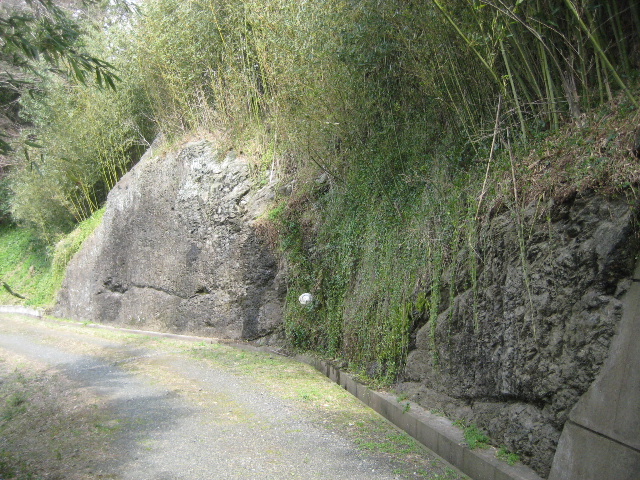 ここへ降りてくる道の山側にある岩が平面状に削り取られている。それも遠目にはコンクリート擁壁の一部と見紛うほど精密に。