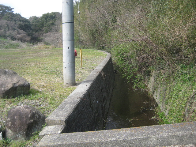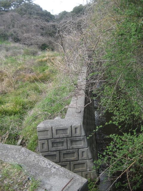 コンクリート護岸上には先が塚穴川の方に曲がった差し筋が突き出ていた。ブロック塀を築くために用意していたものの、施工されなくなったため危険防止に曲げたようだ。