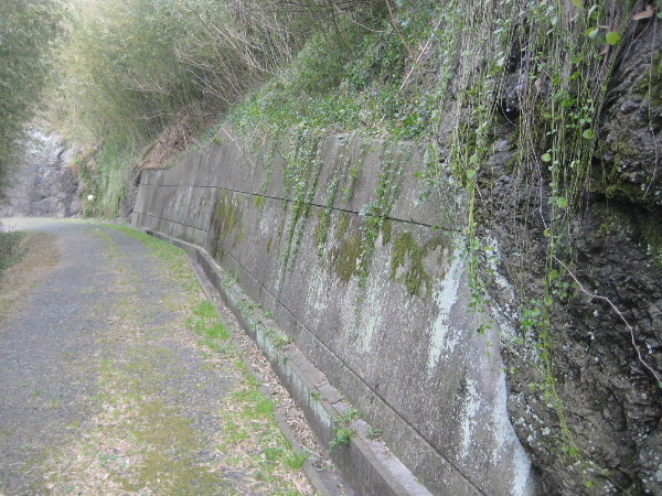 削り取られた区間は結構長い。一部はコンクリート擁壁になっている。岩を削った部分はこの擁壁の転びとほぼ同じなのだ。