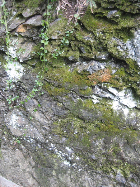 岩の表面は苔まみれで一部は風化している。最近削り取られたものではないらしい。