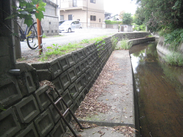 通路部分は練積ブロック、左岸側はコンクリート擁壁で天端にまったく余裕がない。