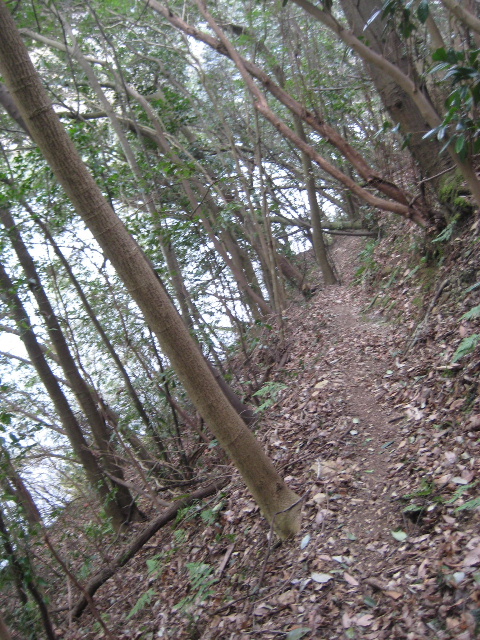 これは持世寺から岸辺沿いに伸びていた道の一部で、現在も急斜面を風化した土が覆っているような状態である。既に一部が崩れ落ちていて持世寺まで抜けることができない。同程度の踏み跡があっても露岩で危険な状態になっていたり、あるいは川面まで転落し流された往来人があったことだろう。