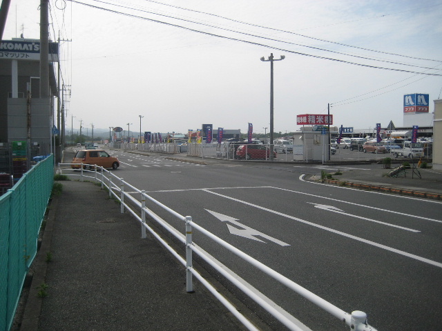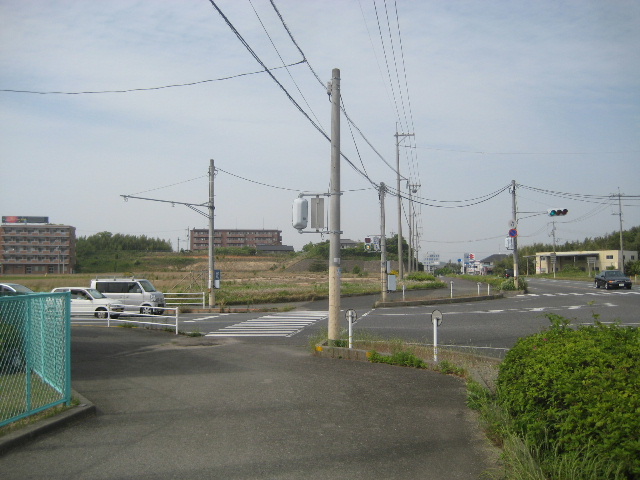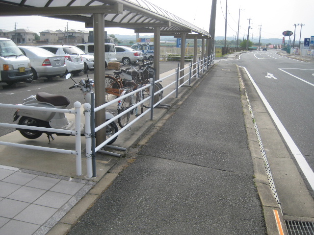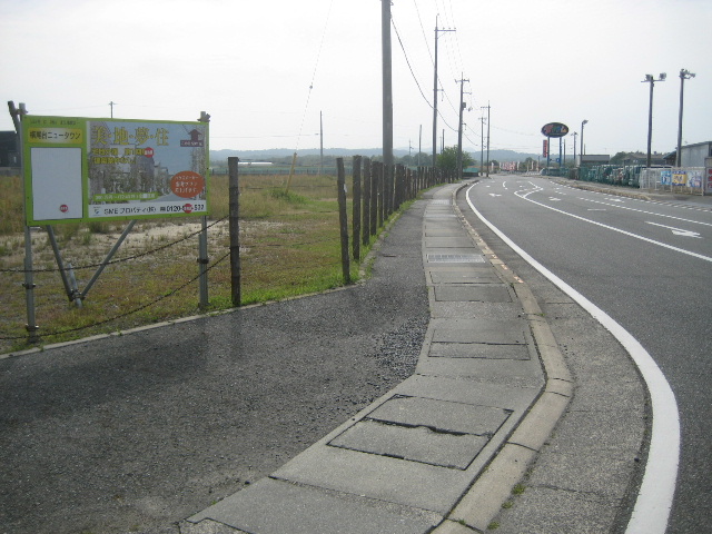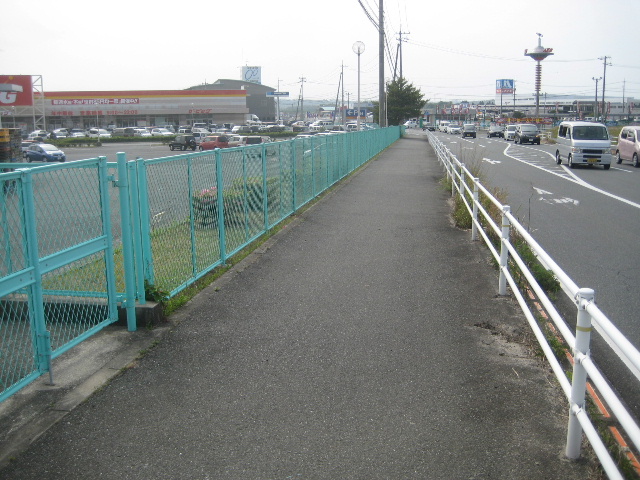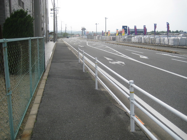 歩道切り下げが何を意味するかは語感から分かるだろう。車道の両側には歩車道境界ブロックが設置され、道路に降った雨水が流れ込まないように歩道は一段高くなっているのが通例である。しかしそれだと車道から敷地へ車を乗り入れることができないので、そのような出入口では縁石の頭を切り下げると共に歩道も車道側へやや傾けて設置して段差を解消する。上の写真を見ると、敷地へ向けての切り下げ加工がされていながら、結局使われなかったようで敷地はネットフェンスで締め切り、乗り入れ口部分もガードパイプを設置して塞いでいる。