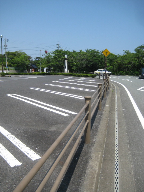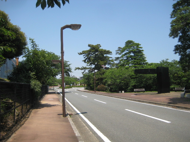 正面駐車場の派生記事でも述べているように、かつての市道は正面入口側に寄っていた。そのため市道の取り付け部はT字路ではなく変則的な形で、西駐車場方面へ車で移動するとき殆どUターンに近い鋭角な切り返しを要した。特に大型車両では大きく外に膨らんで転回しなければならず不評だった。駐車場との位置交換でこの問題も合わせて解消された。