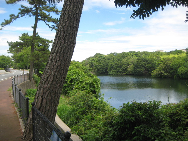 松の木の間から右側には押し黙ったような表情の溜め池が見えている。市外や県外から常盤公園に訪れる観光客は、バスなりマイカーなりでこの市道を通るだろう。その折りに国道からも目立つこの溜め池を見て常盤池だと誤解されることが非常に多い。
