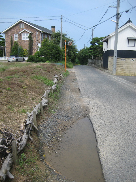 正規のアスファルト舗装外側の至る所が窪んで水が溜まっている。