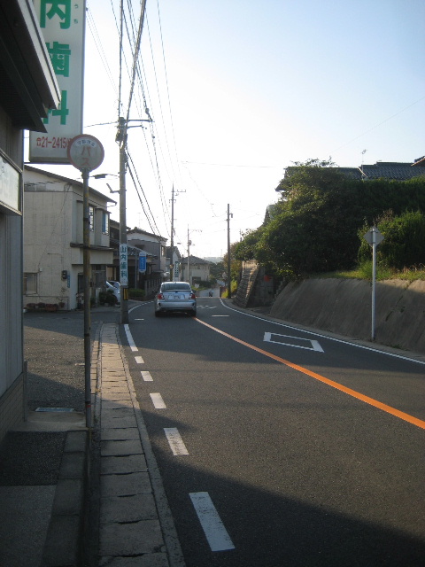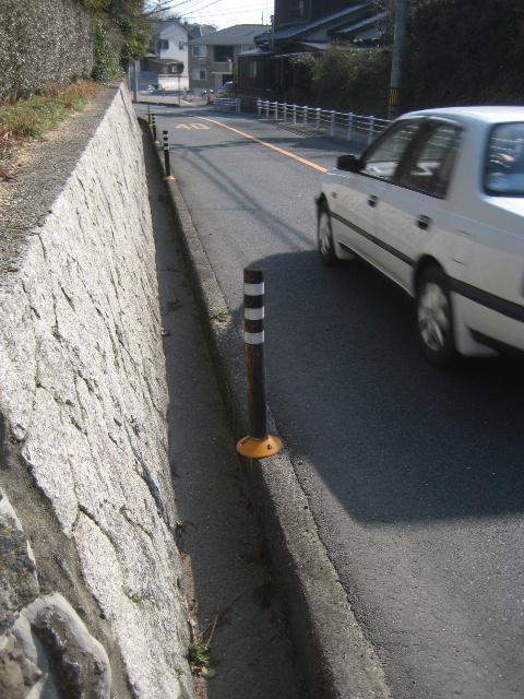 バス路線でありながらこの区間は狭く歩道がまったくない。しかも路肩と側溝の間という嫌な位置に電信柱が立っていたりする。