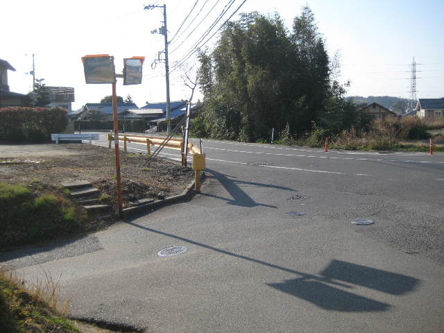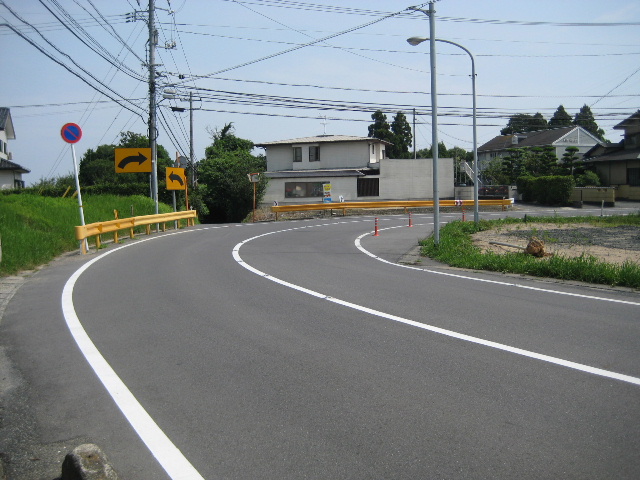よく見ると、舗装の施工継ぎ目もここで右折方向についている。もっとも路線として異なるというだけで、直進する道も相応な利用価値がある。交通量としては本線に沿った流れが多いようだ。十字路に沿って植え込みが密になっているために交差点の見通しは極めて悪い。直接の目視が効かないのでこういう場所を車で通るのは昼間よりも夜間の方が容易である。遠くから黄色いライトを視認できるからだ。もっとも仮に鉢合わせになっても十字路は相応な広さがあるので、お互いが大きく内回り・外回りすることで離合可能だ。