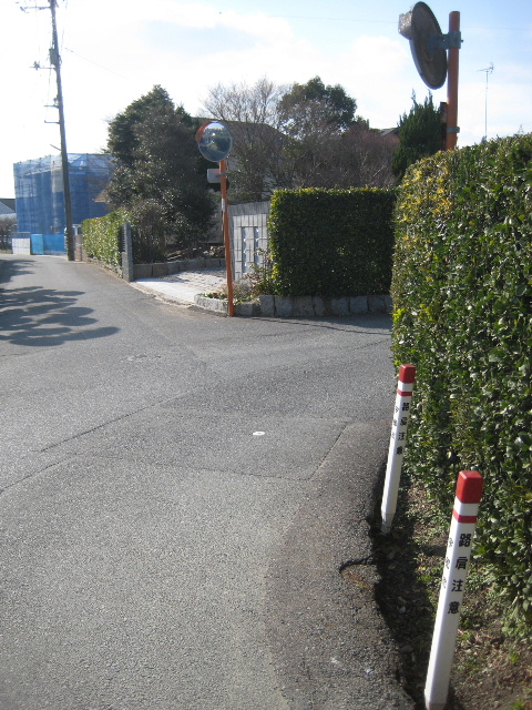 カーブの内側は地面が痩せているために脱輪防止の柱が立っている。