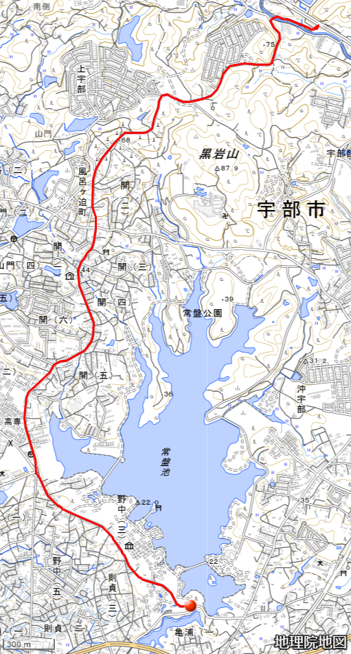 縦断方向の起伏は、市道楢原線との分岐を過ぎた辺りからゆるやかな登りとなる。登りは開交差点へ至るまで続く。この経路もほぼ尾根伝いで、常盤池を築造した椋梨権左衛門俊平公が川上から常盤池の様子を偵察しに往還した道であり道の両側に松が植えられていた。[1]