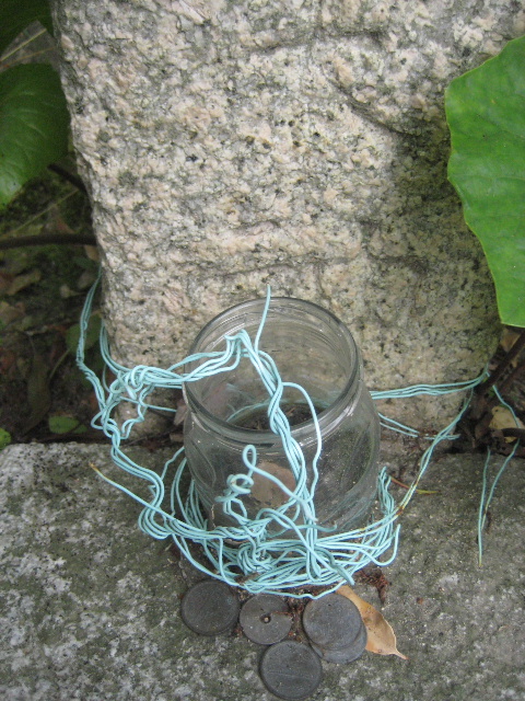 花を活けるためのガラス瓶と共に賽銭が置かれていた。