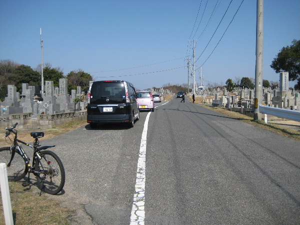 お盆や彼岸に限らず天気の良い休日などはこのように路肩に車を停めて墓参する人が目立つ。