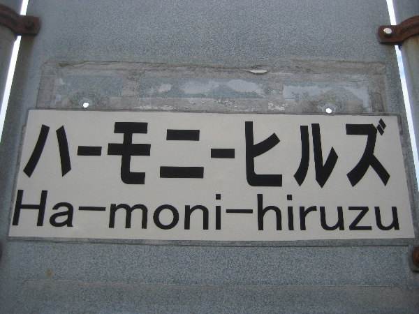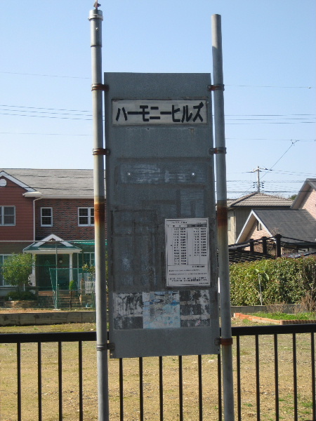 誰の目にも「ハーモニーヒルズ」と読めるバス停名をわざわざ剥がし、新たに奇妙な引き算の数式みたいなローマ字併記のものに貼り替えているのである。もしかすると「ハーモニーヒルズ」という片仮名だけでは読めずに困る人が居るかも知れないのでという塩梅だ。